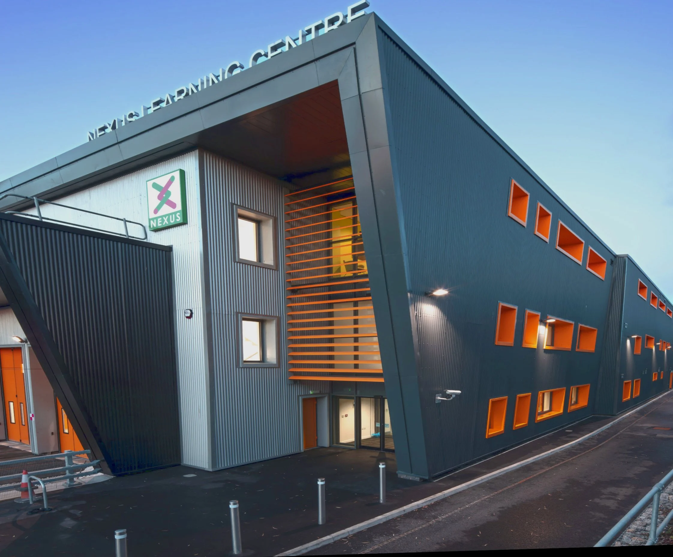New special needs school featuring standing seam roof and wall claddings to upper floor and roof, with areas of Cedral ventilated rainscreen plank cladding to entrance areas at ground floor level.